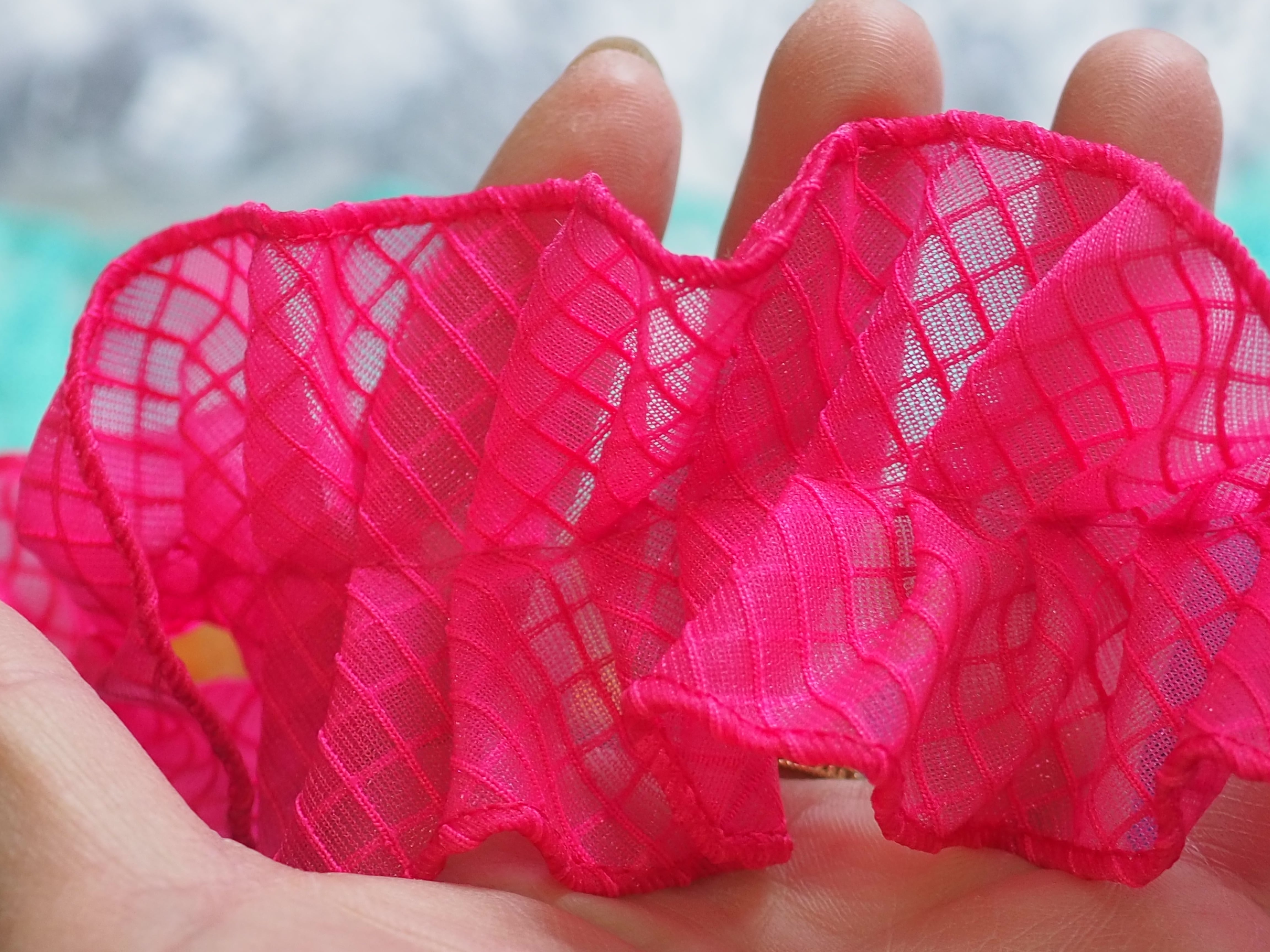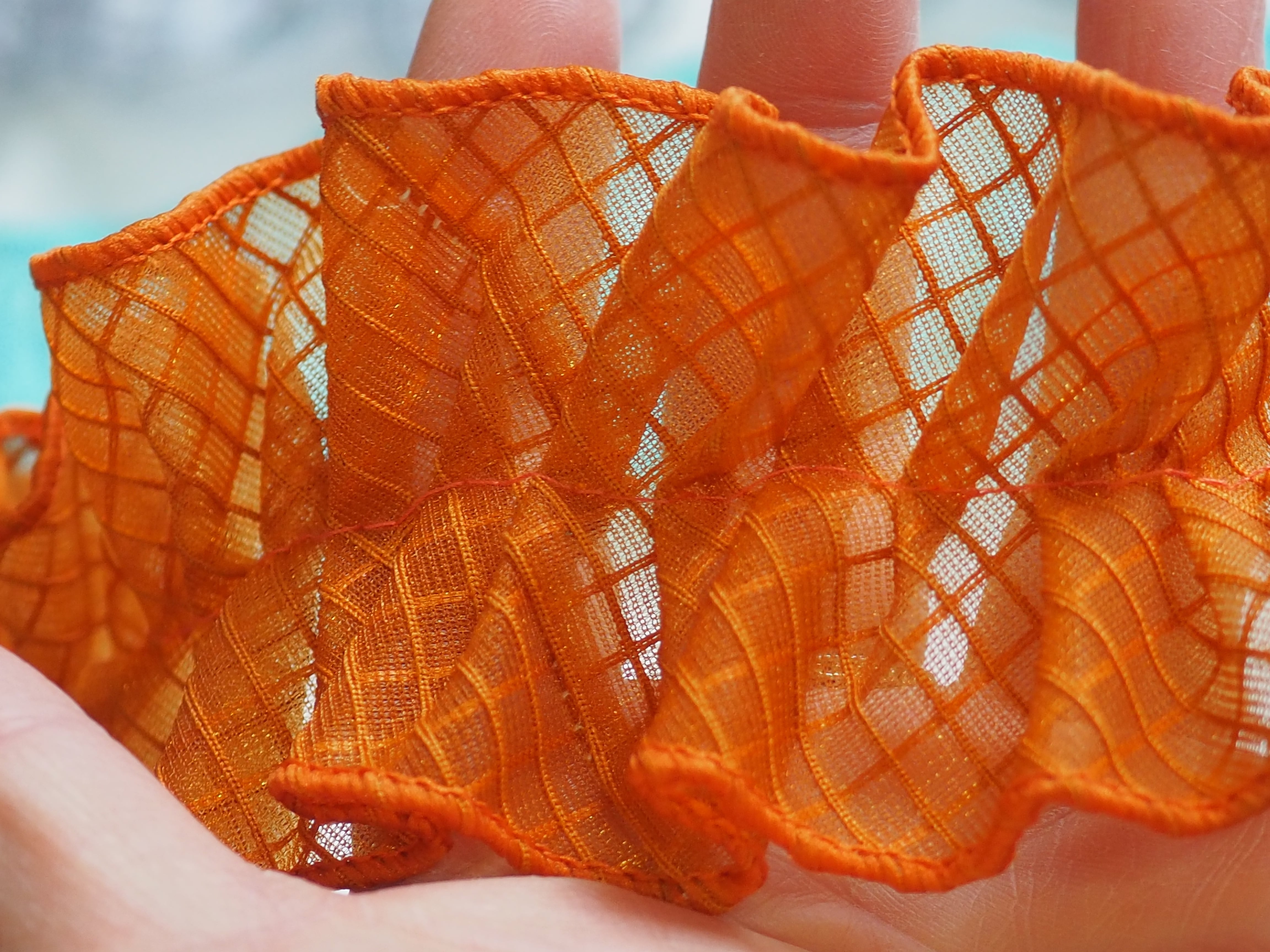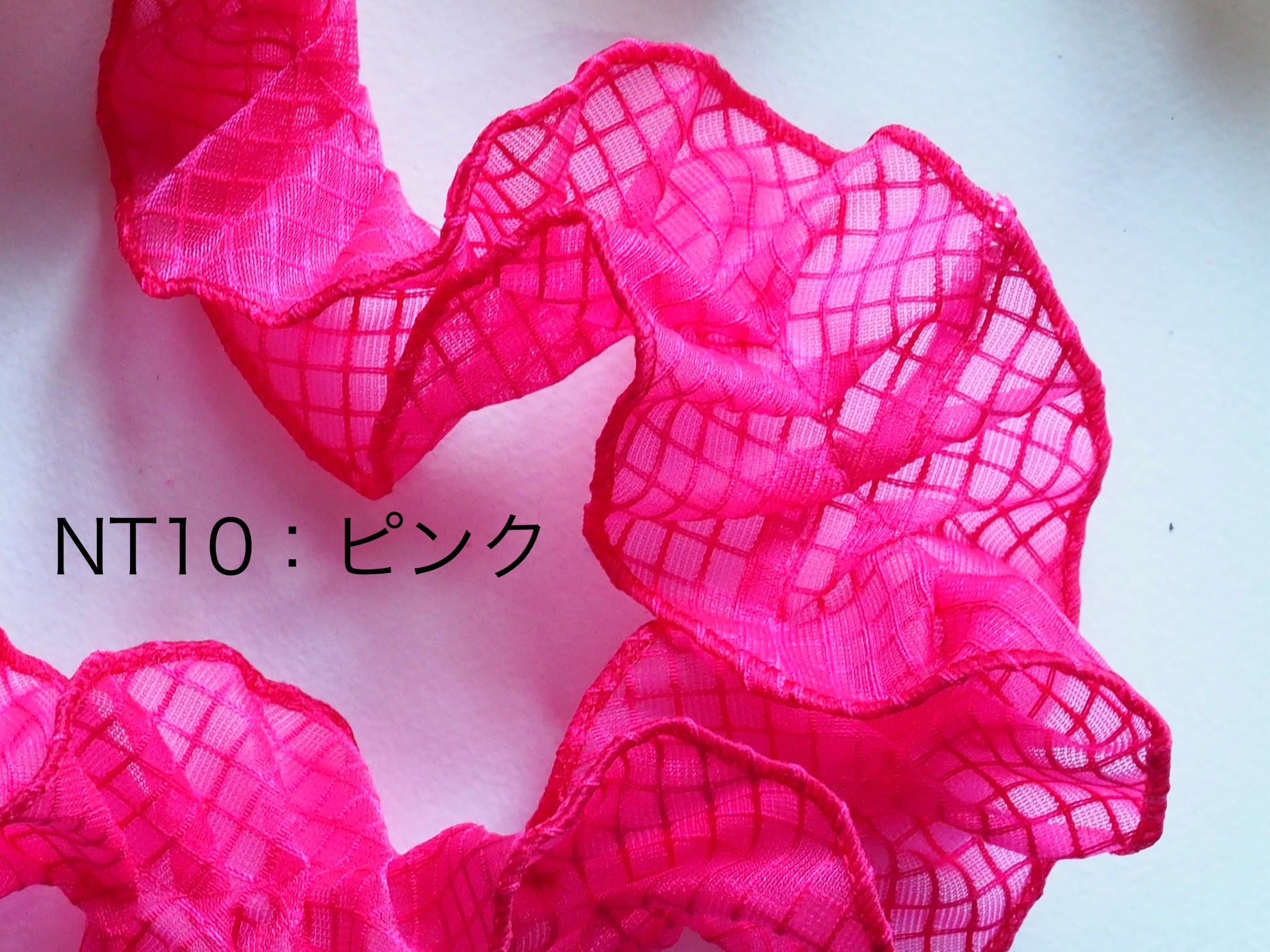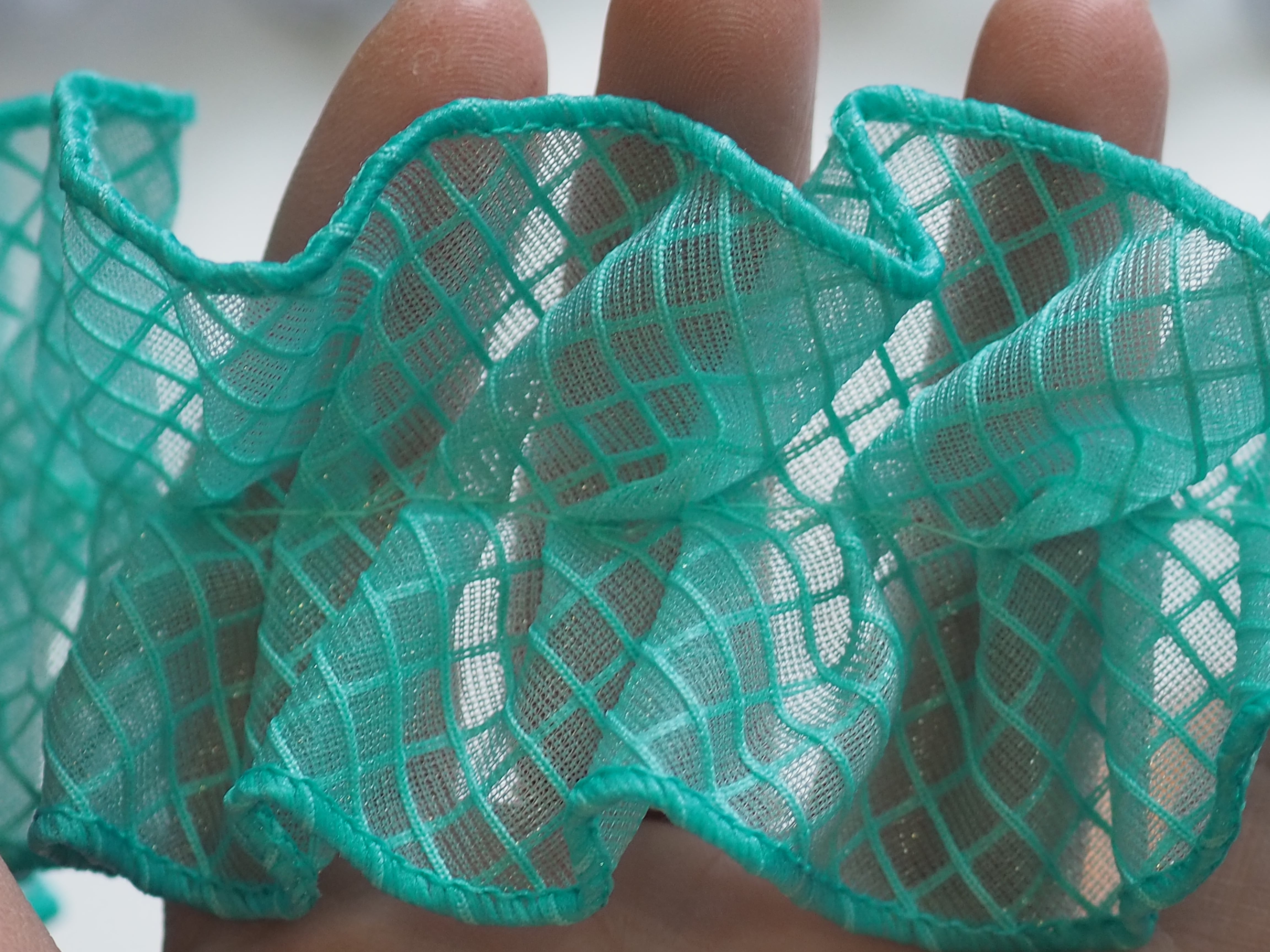 透明のPVC素材を使用したネットビニール生地で作った新素材フリルリボンです。
