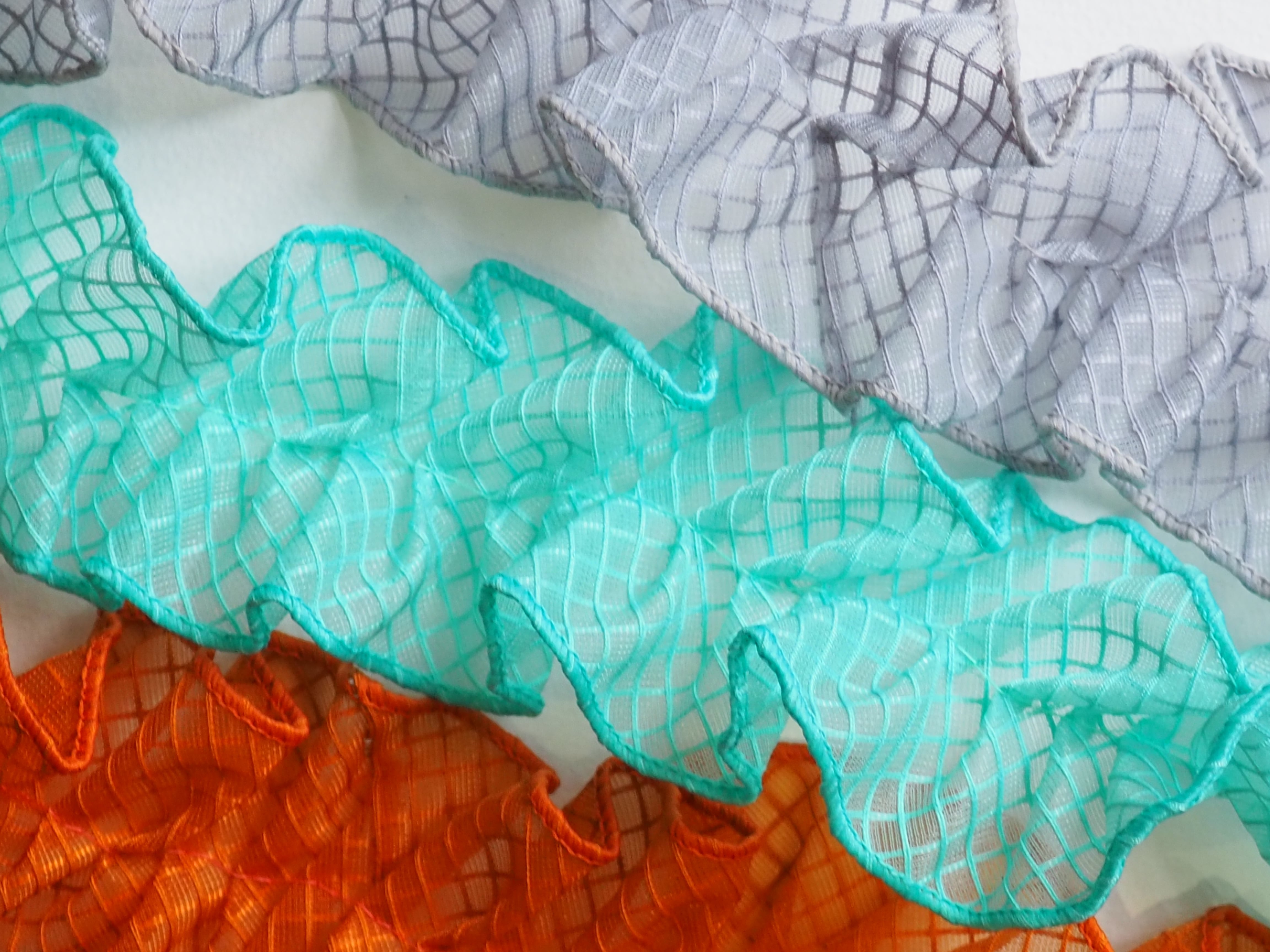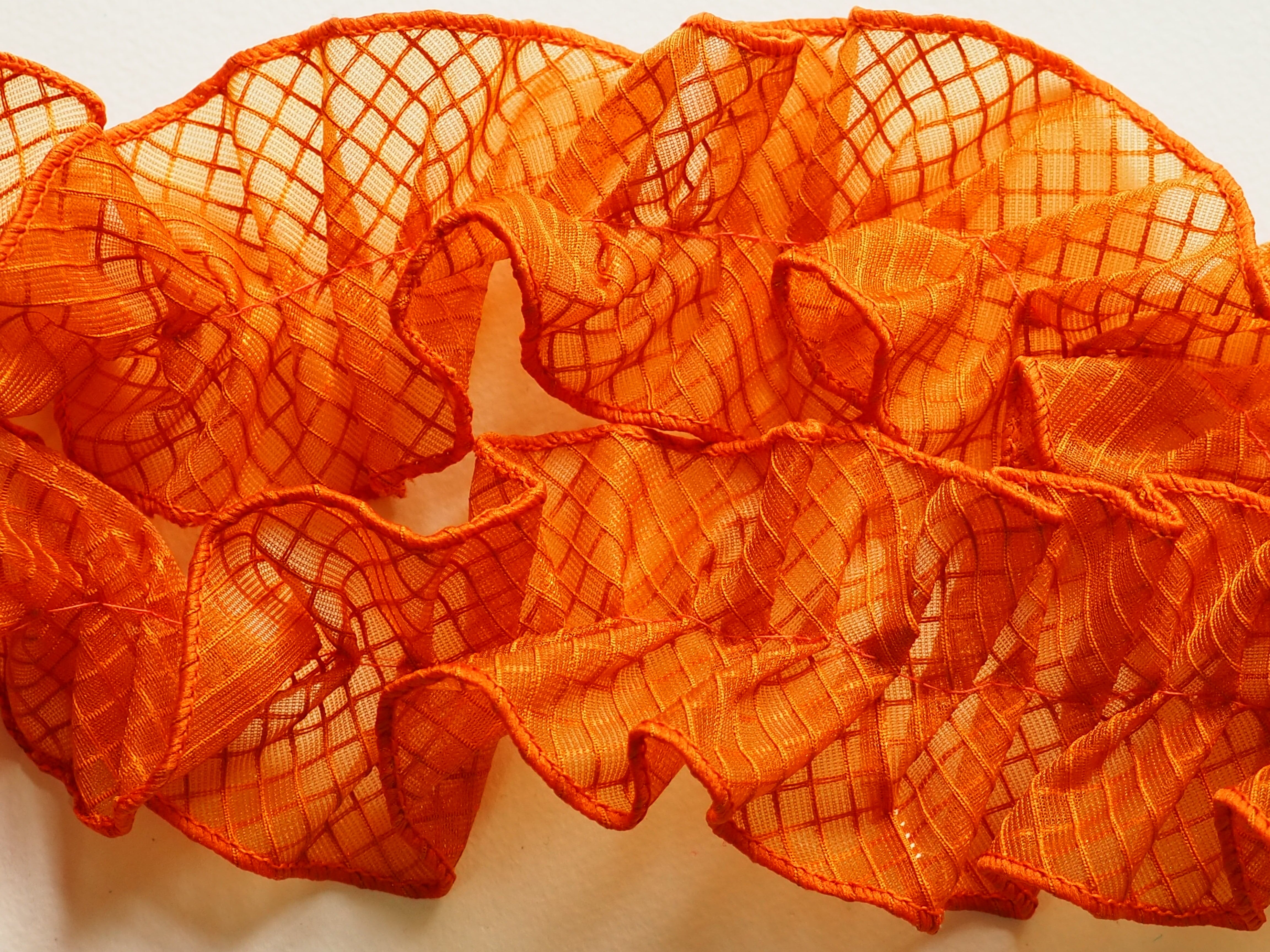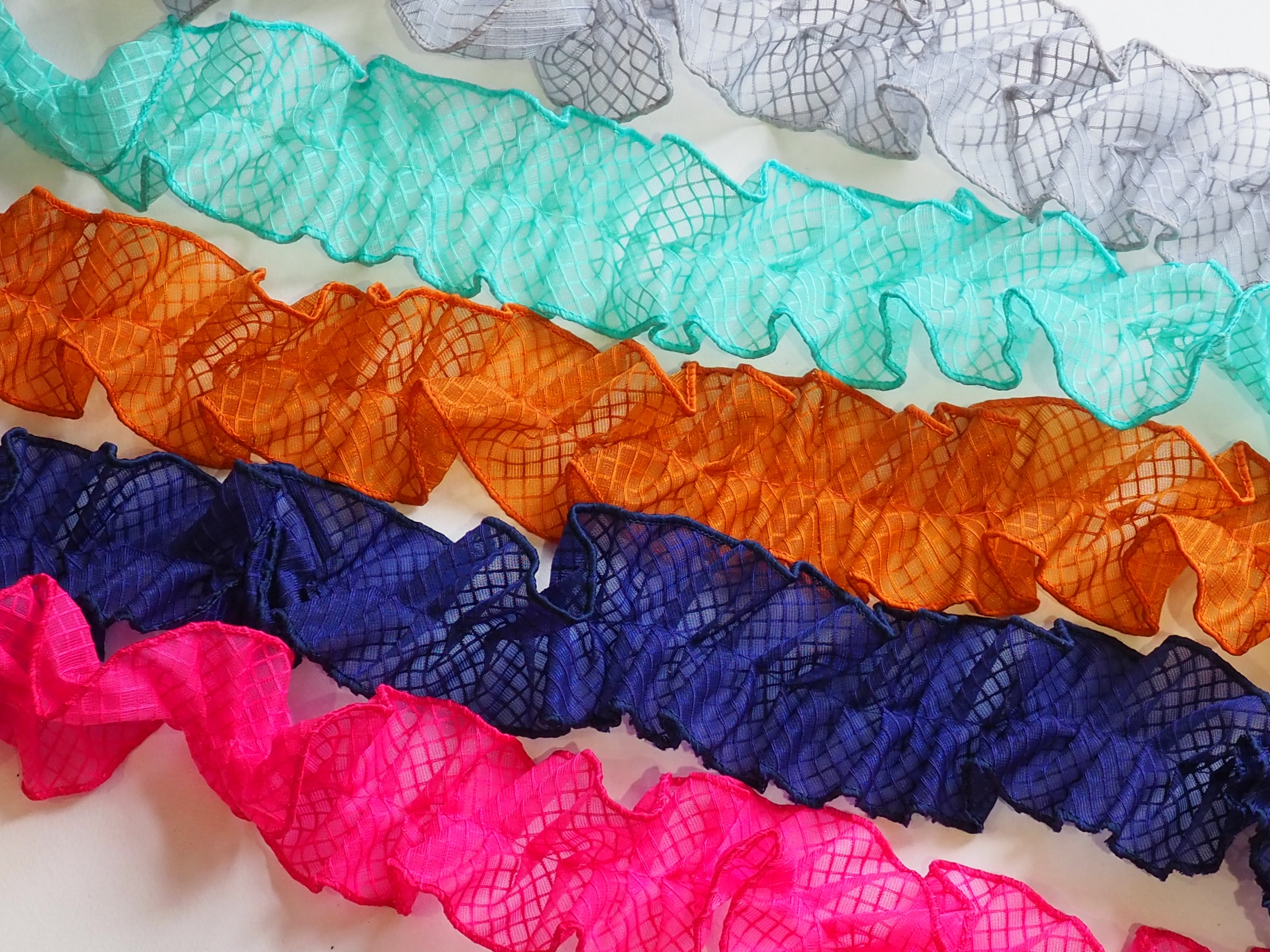 透明のPVC素材を使用したネットビニール生地で作った新素材フリルリボンです。