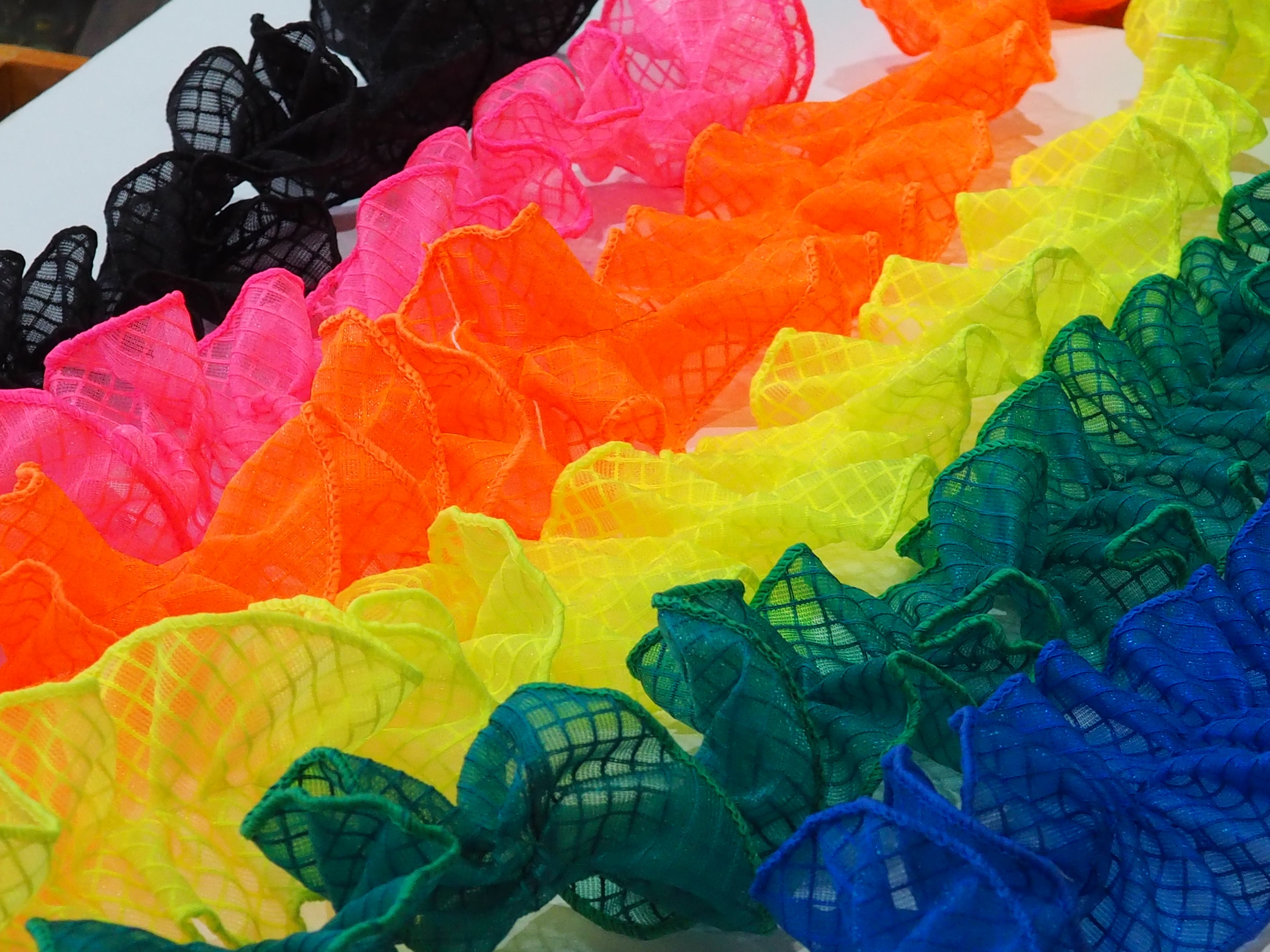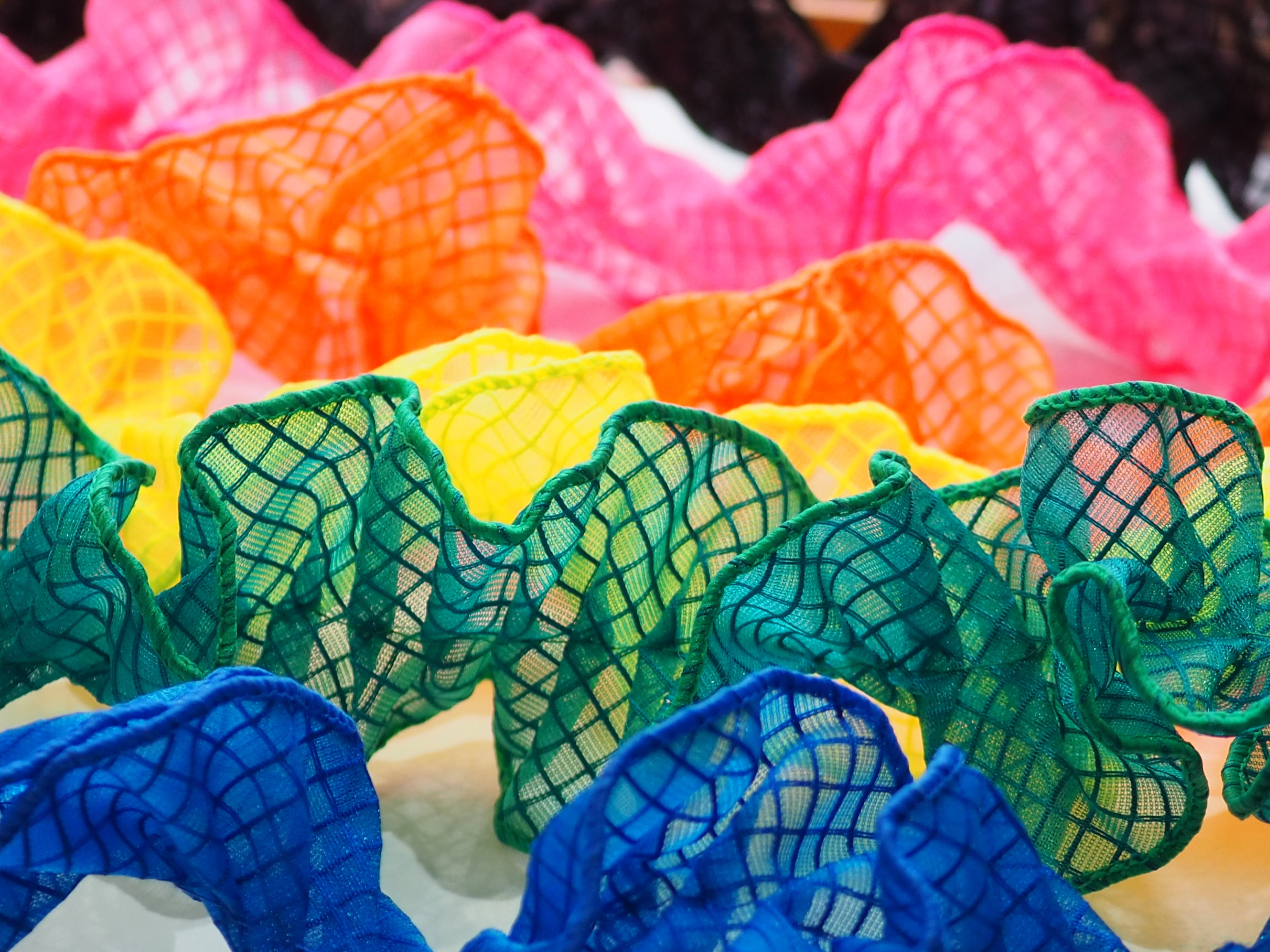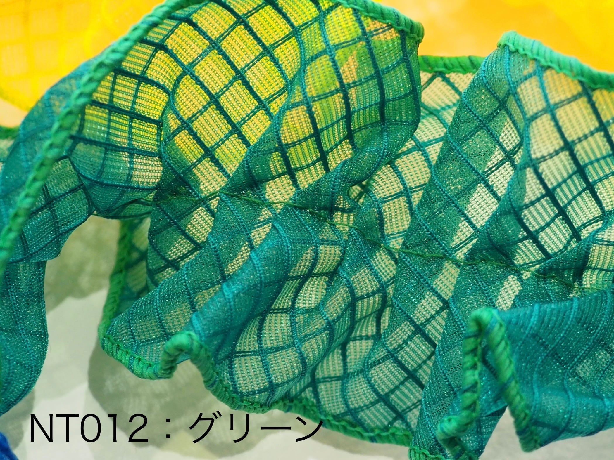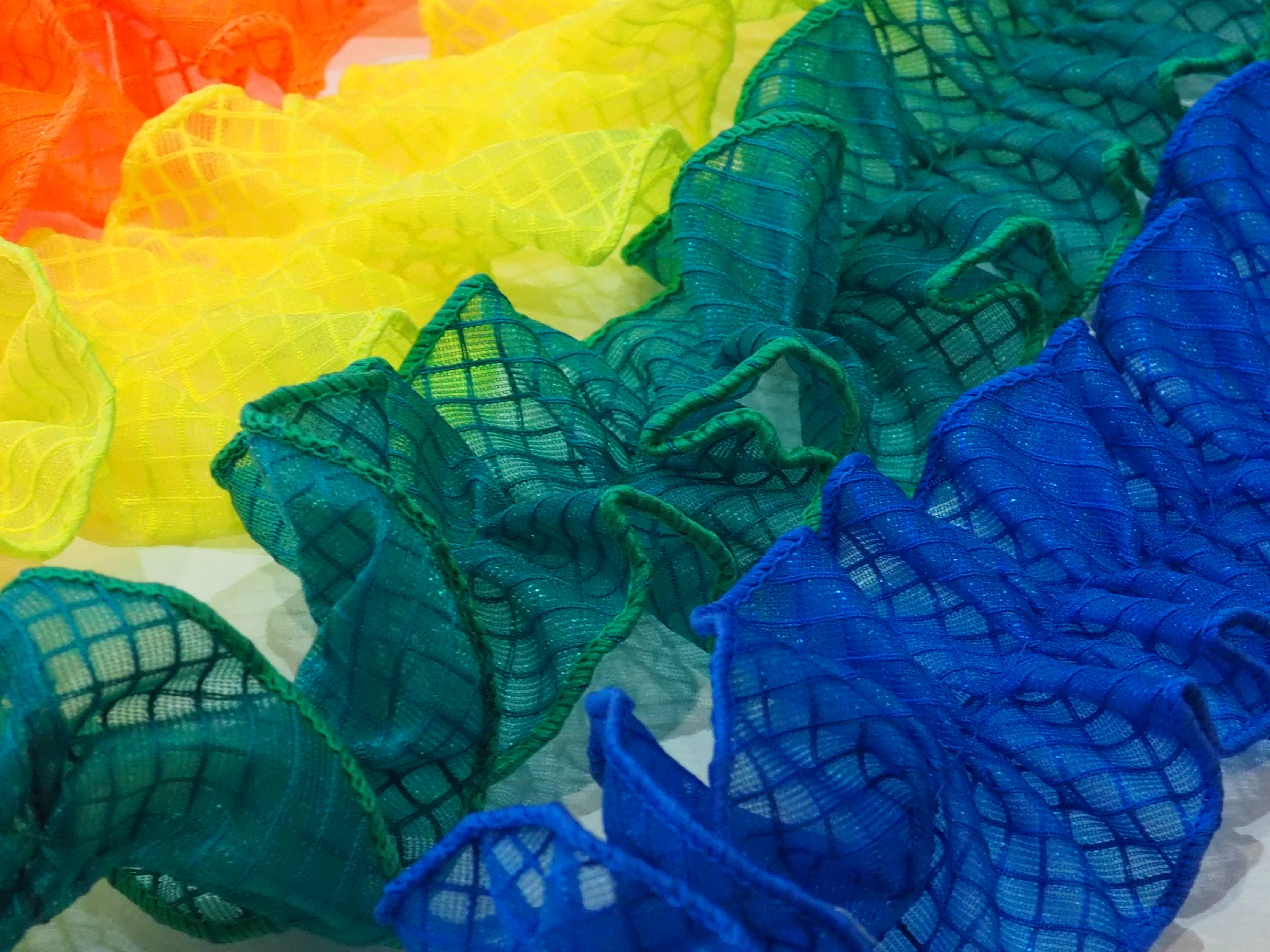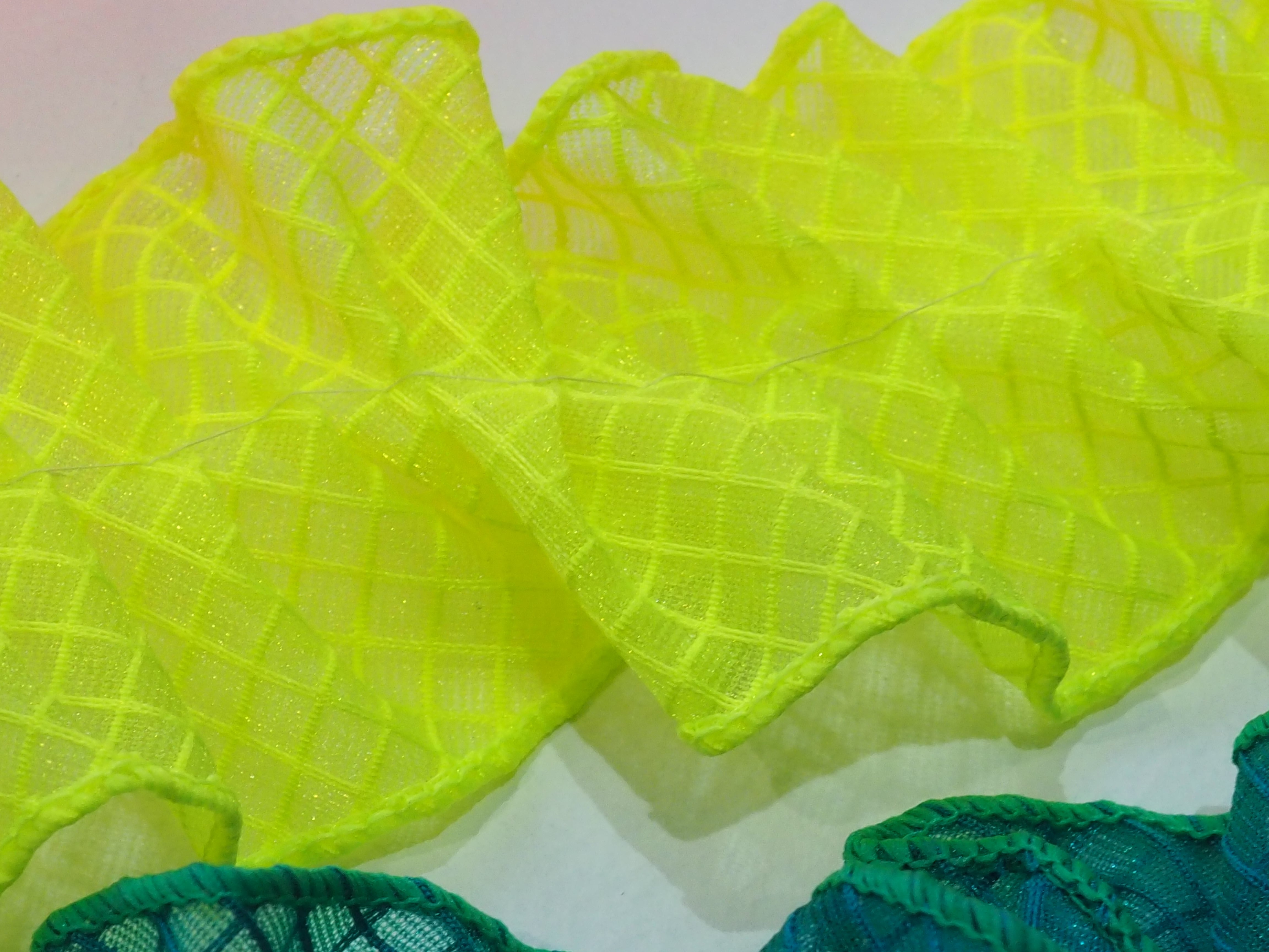透明のPVC素材を使用したネットビニール生地で作った新素材フリルリボンです。