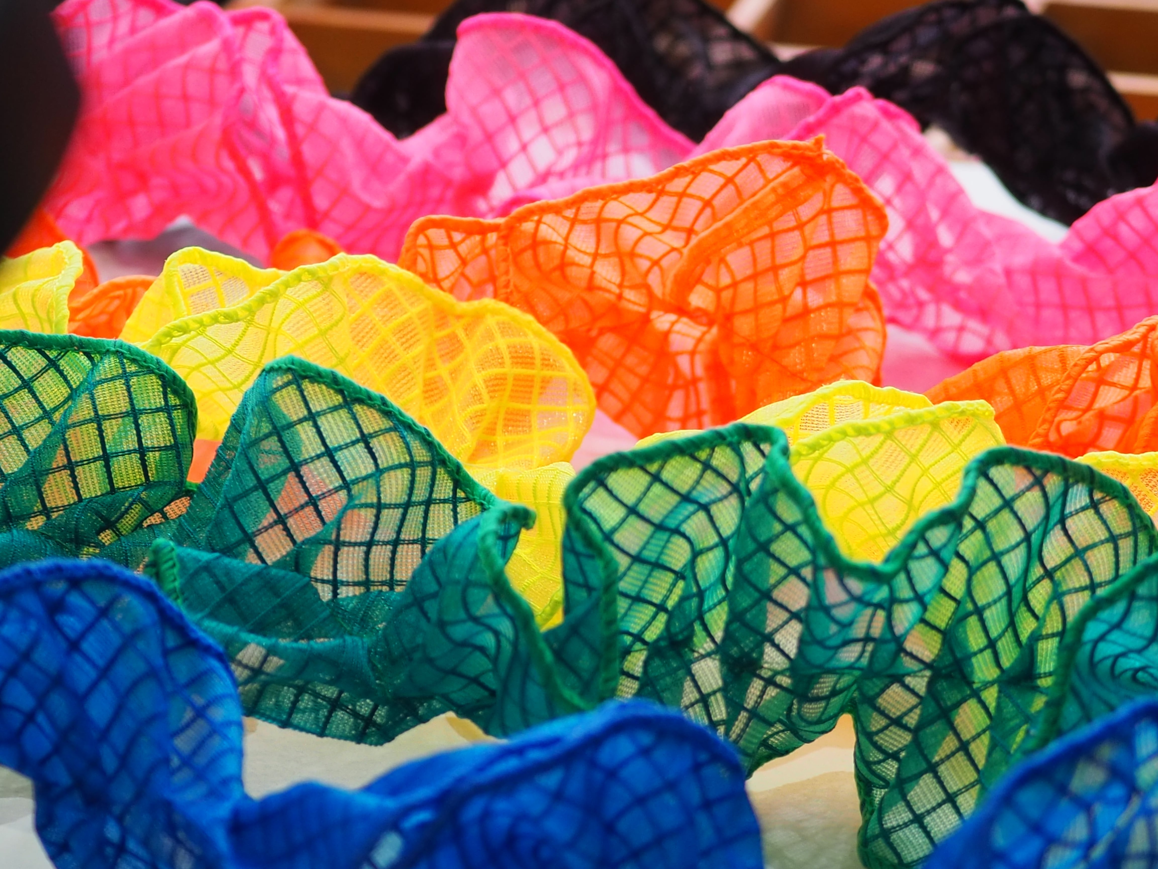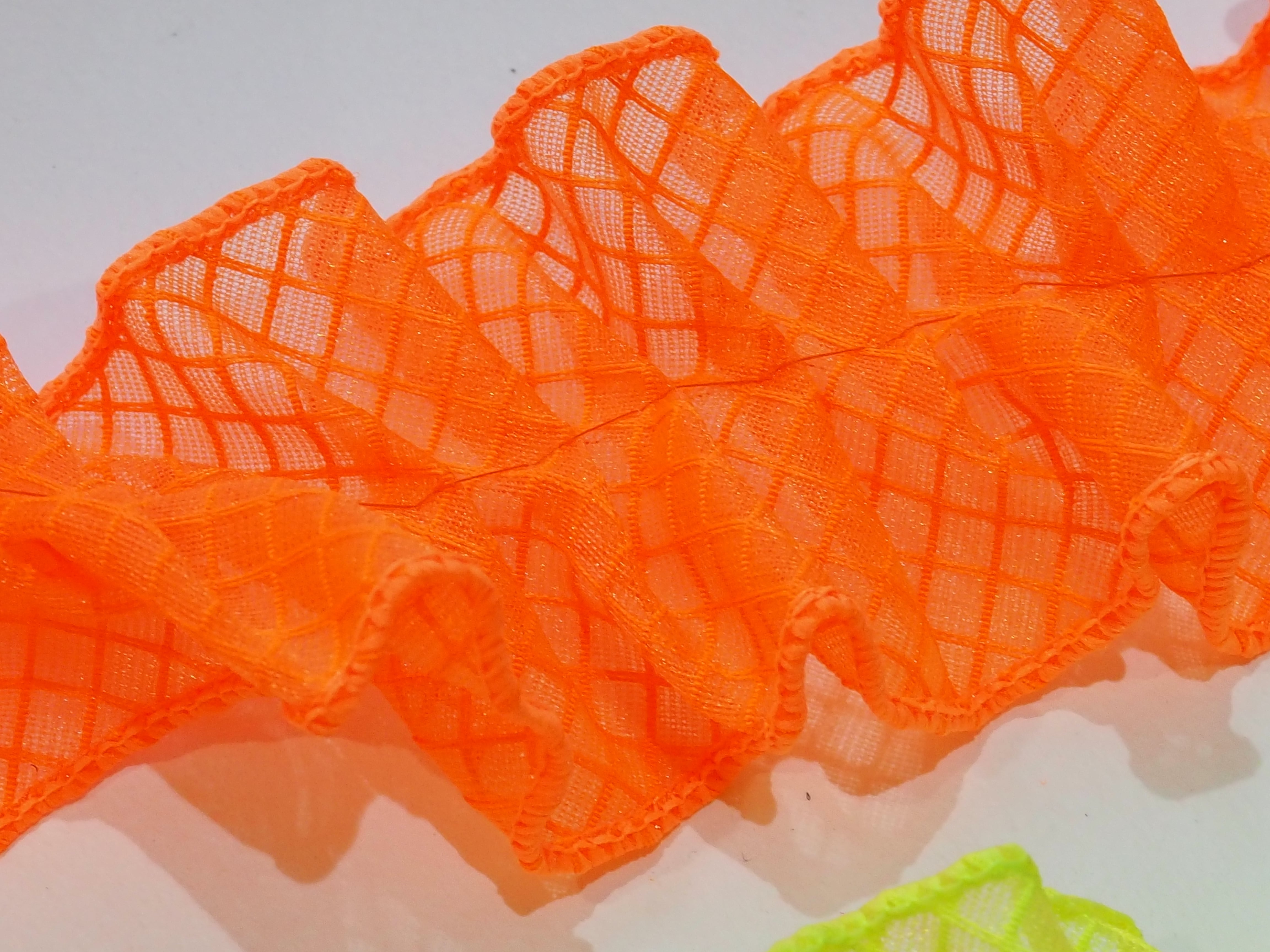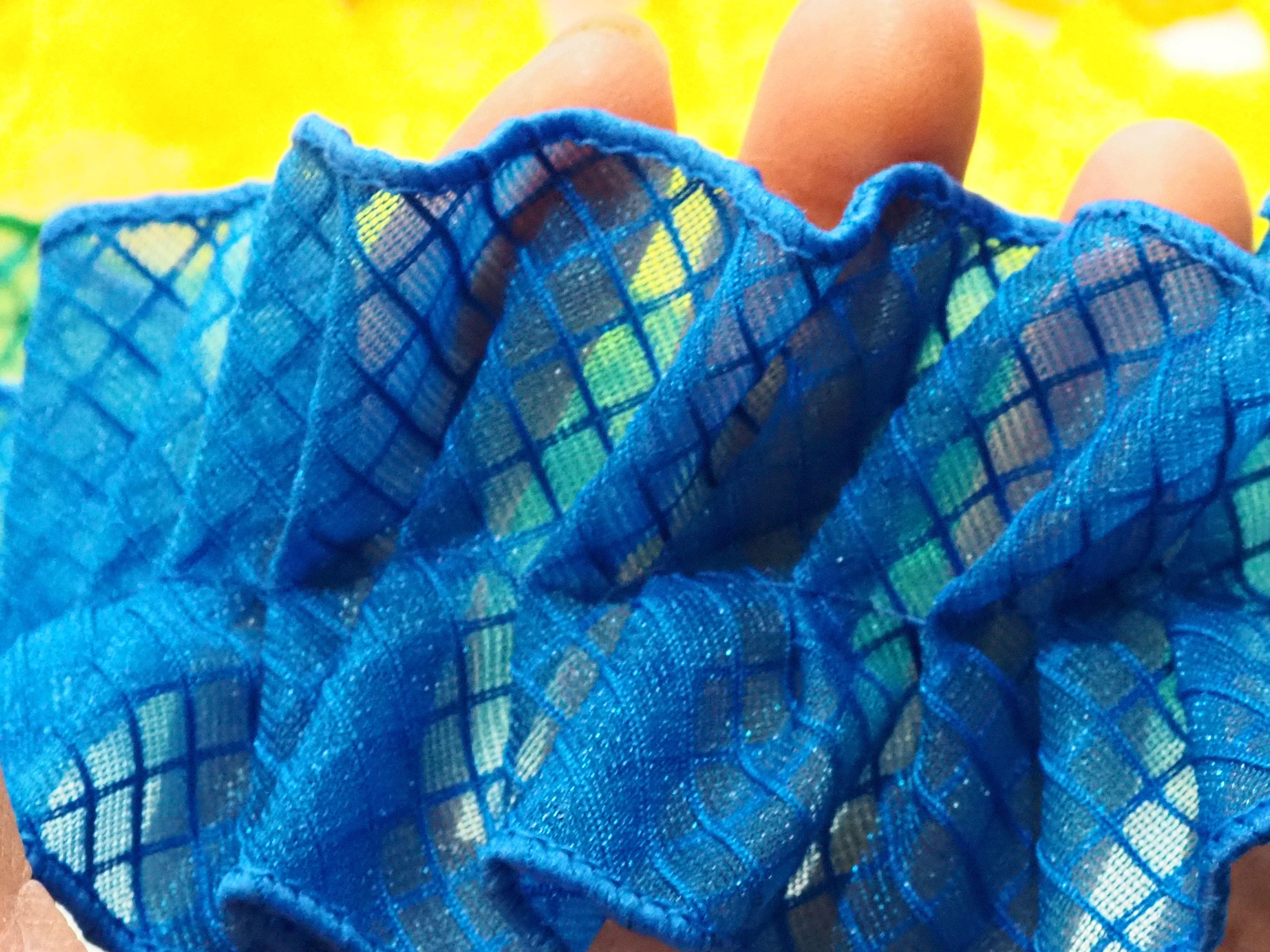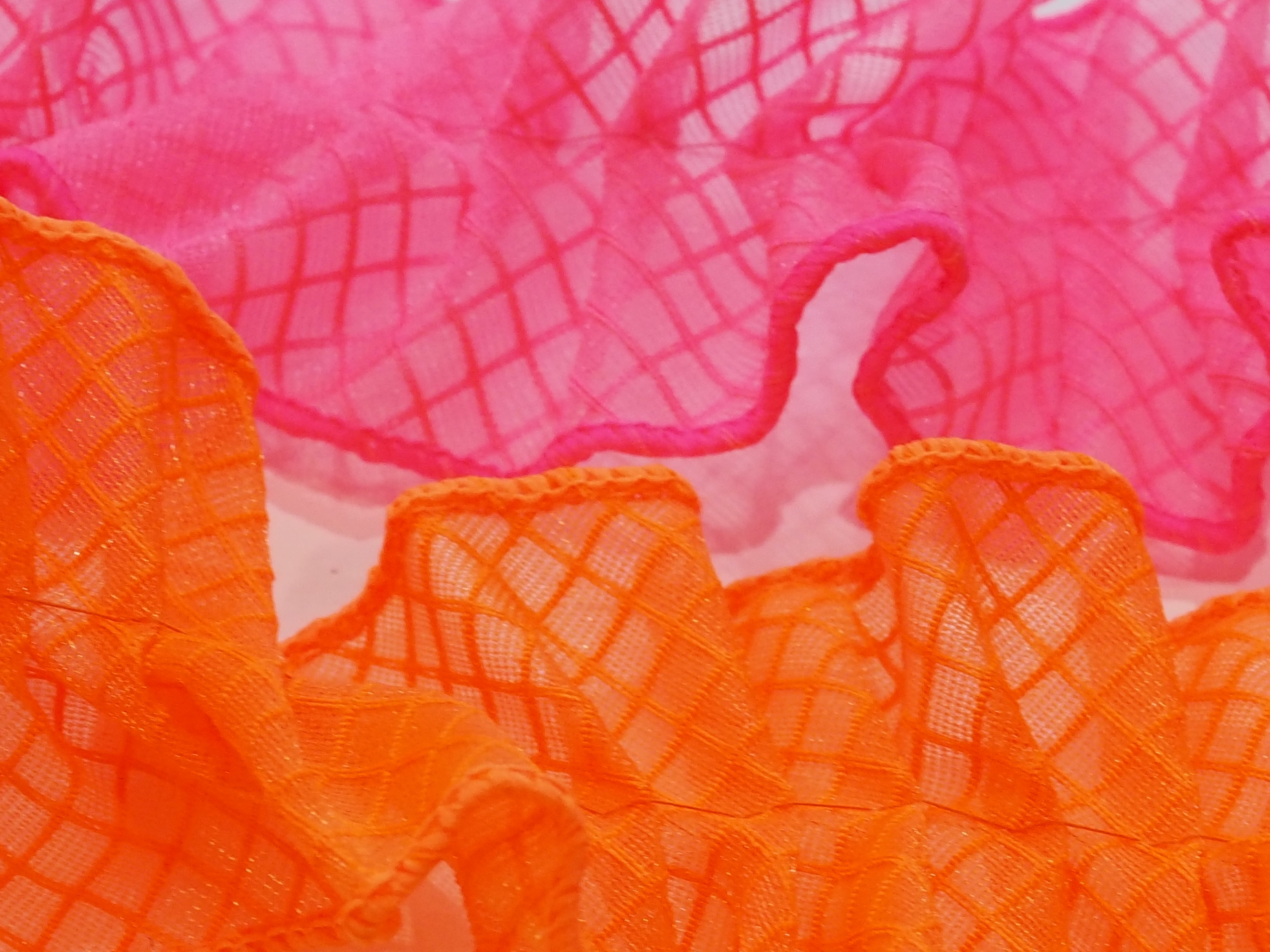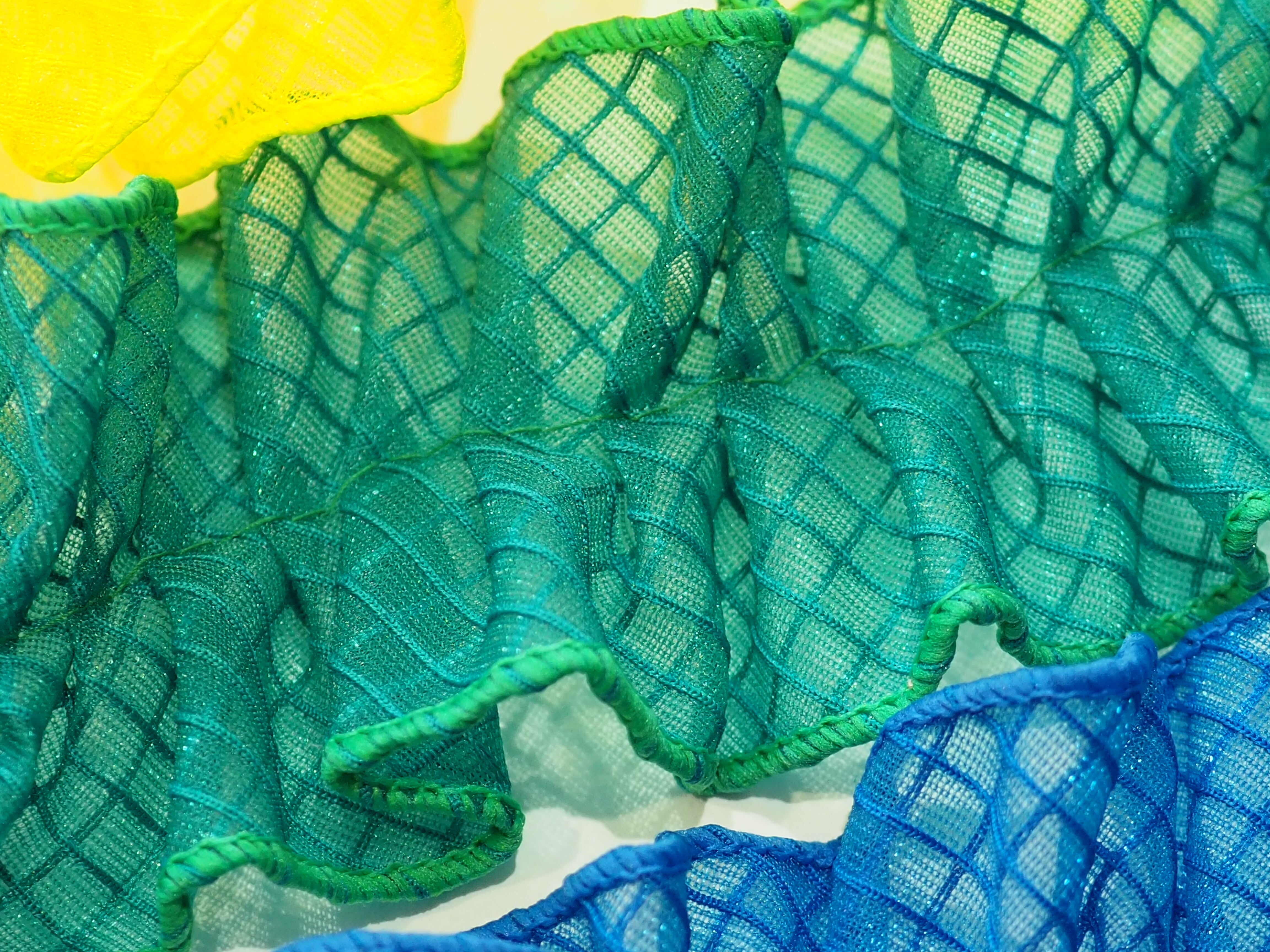 透明のPVC素材を使用したネットビニール生地で作った新素材フリルリボンです。