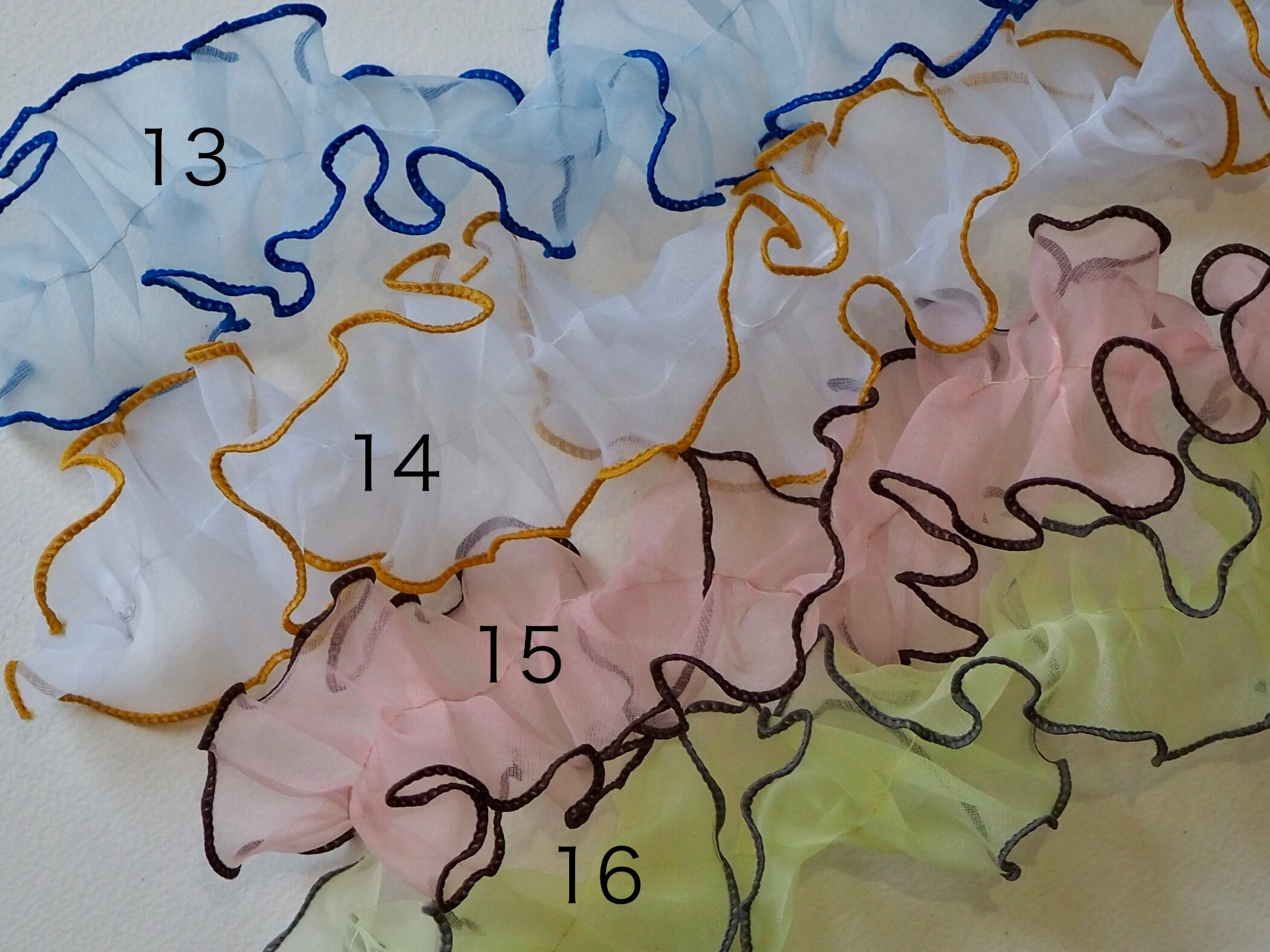縁取りしたカラーの糸が作品を華やかに引き立てます。
